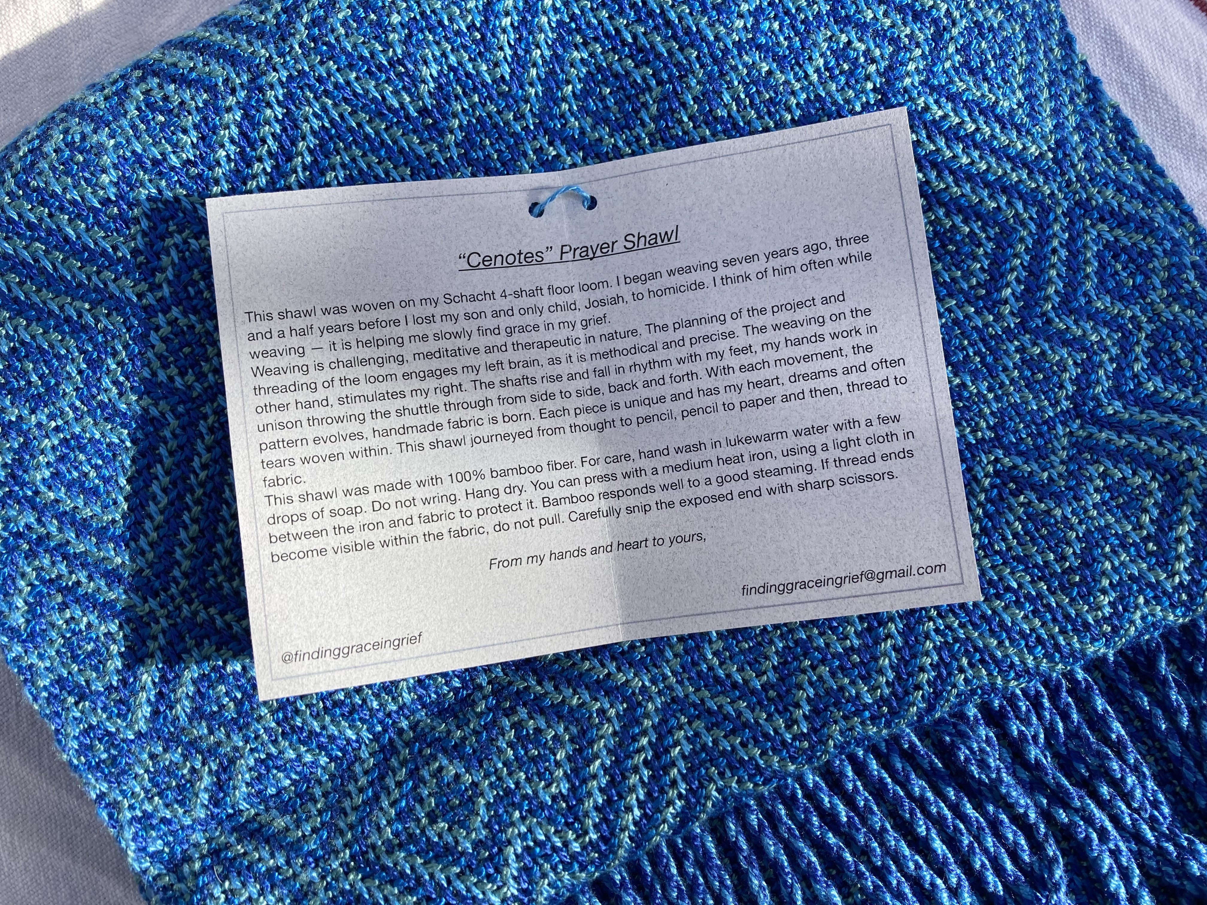 “Cenotes” is handwoven on my 4-shaft Schact Baby Wolf loom which came to me from Ben’s late wife Tui. You can read about Ben in Remember the Birds as he is woven throughout the book, my ride-or-die white-haired confidant and best friend. The fabric is made from 100% Bamboo which has excellent drape and the ability to cool in the summer and warm in the winter. It is both eco-friendly and hypoallergenic.