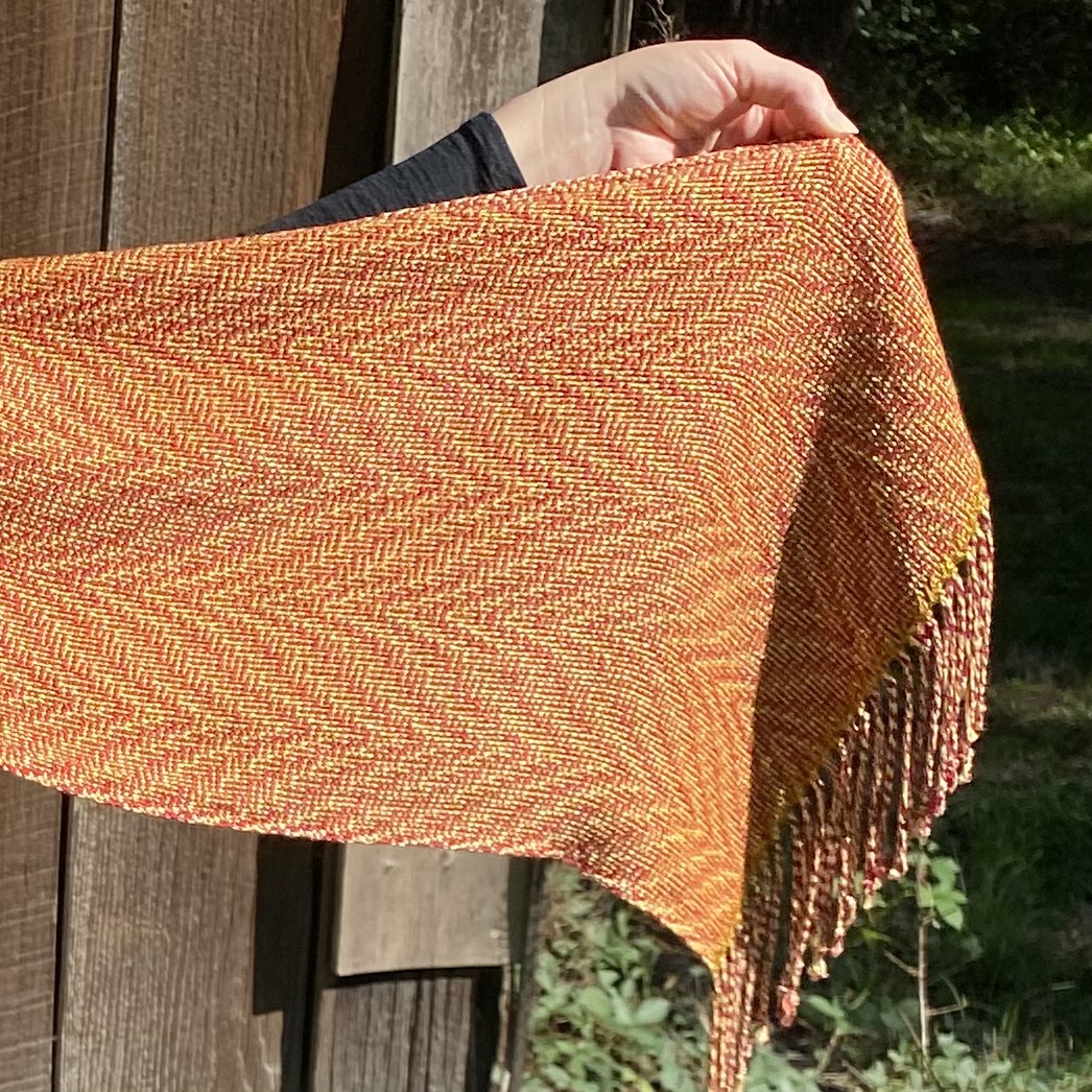 Both pieces measure 13.5″ wide by 72″ long (not including fringe) and were handwoven on my 4-shaft Schacht loom in 100% bamboo, a hypo-allergenic and renewable fiber. Bamboo has excellent drape (the way it hangs effortlessly) and is cool in the summer while warm in the winter.